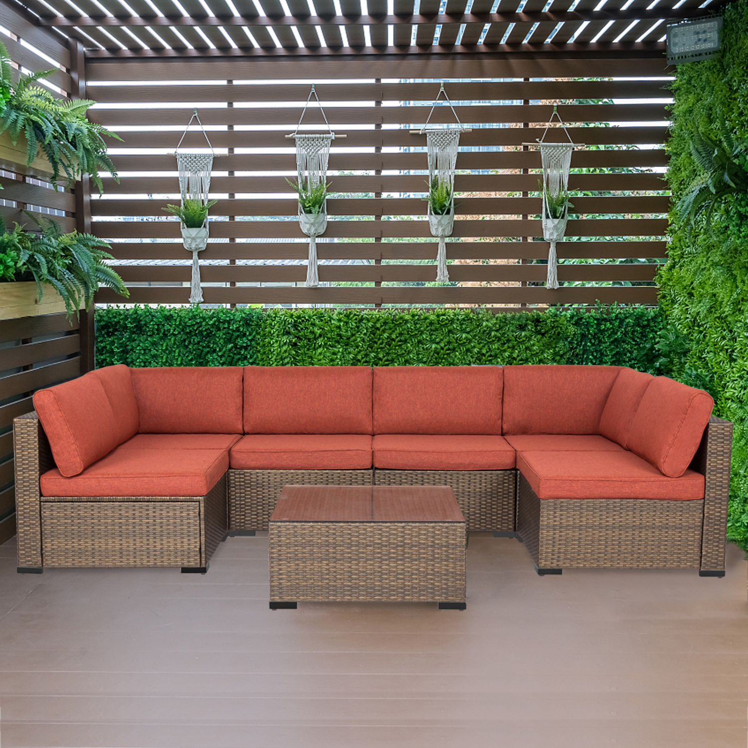 Alaulm outdoor patio furniture sets 7 piece outdoor sectional furniture pe rattan wicker patio sofa backyard deck couch patio conversation chair with coffee table & thick sand/khaki cushions. At lowe's, we carry an assortment of patio furniture to fit every style and space, making it easy to update. Shop our selection of comfortable cushioned lounge chairs, sofas, loveseats, and sectionals. 4.3 out of 5 stars 59. When choosing the best outdoor furniture for your space, consider the size of your patio or deck and the look you want to achieve.